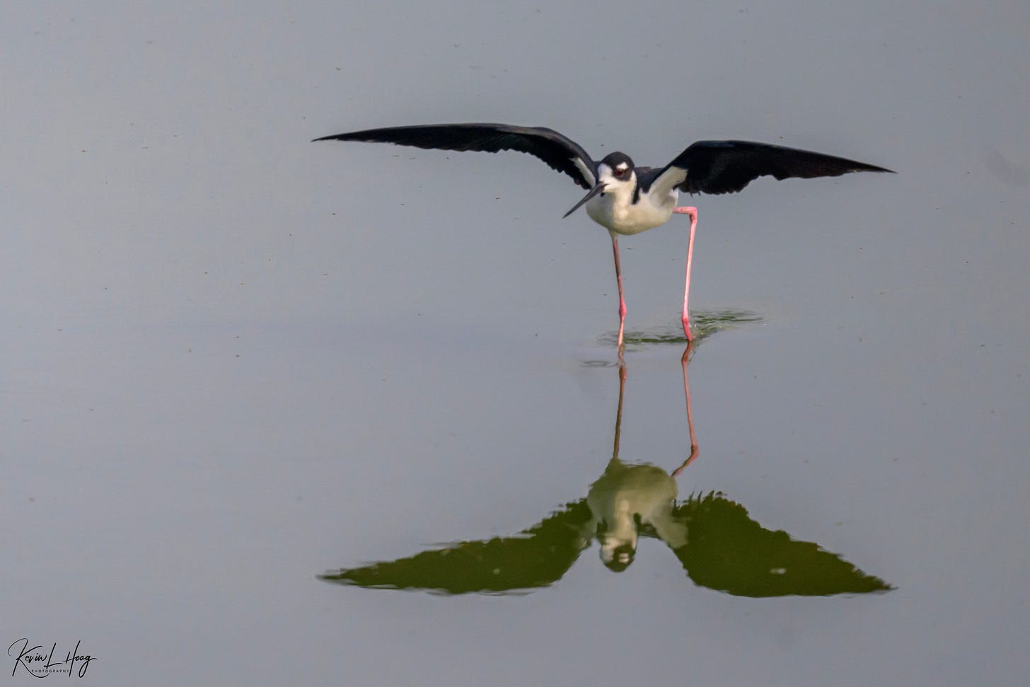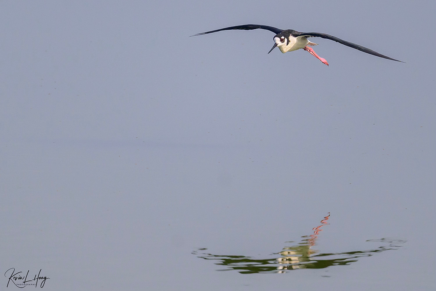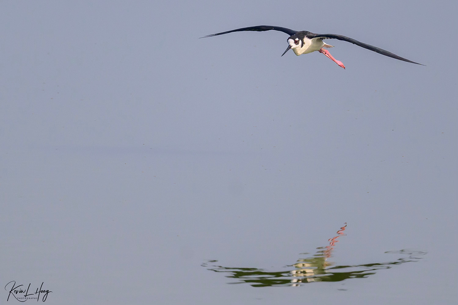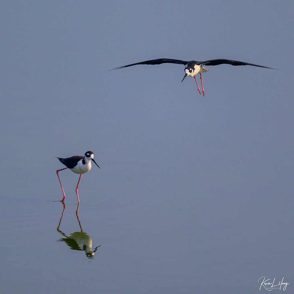 In this photograph a Black-necked Stilt was flying toward me as it came in for a landing in a pond where other Stilts were wading. I could see the bird approaching from a distance, giving me time to switch to multiple frame (continuous) shooting and establish focus on the flying bird in my viewfinder. By using a rapid frame rate I could be assured of finding the frame in which both the flying bird and the wading bird were in the same focal plane, or at the same distance from my camera. As a bonus, I kept images taken slightly earlier and just after landing.